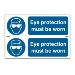Mandatory blue and white sign, highlighting the need for personal protective equipment. 2 signs per sheet Sheet Size: 300x200mm  PVC Self adhesive back  1 per sheet Eye Protection Must Be Worn Image & Words..